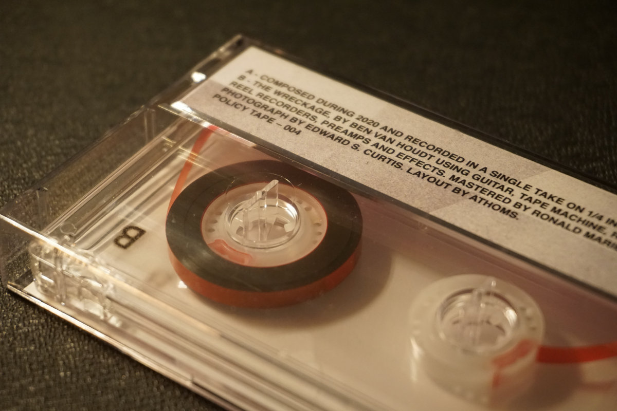 Pro dubbed cassette tape loaded with high quality ferric Fox and spliced with red leader. Layout by Athoms, printed on heavy card stock. Released by Taping Policies.
